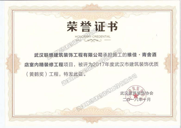 2017年度武漢市建筑裝飾優(yōu)質(zhì)工程黃鶴杯(維佳 青舍酒店室內(nèi)精裝修工程)