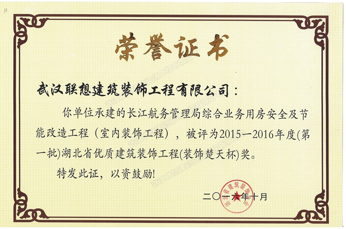 2015-2016年度湖北省優(yōu)質(zhì)建筑裝飾工程楚天杯(長江航務(wù)管理局綜合業(yè)務(wù)用房安全及節(jié)能改造工程)