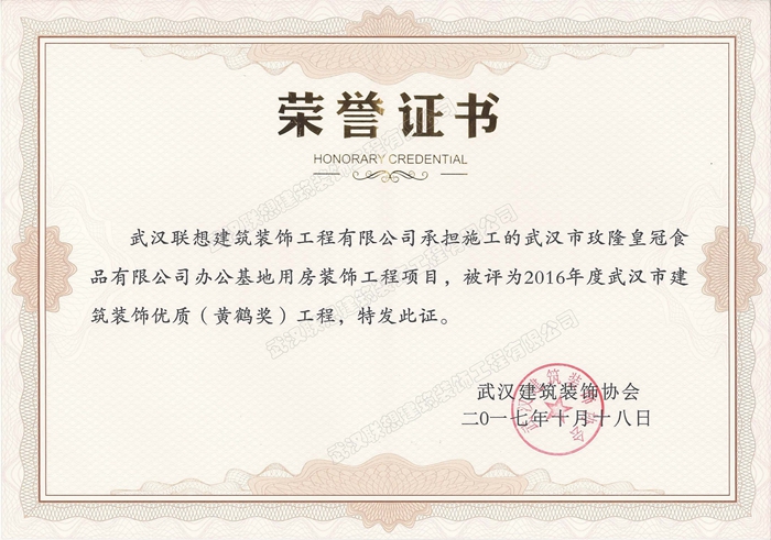 2016年度武漢市建筑裝飾優(yōu)質(zhì)工程黃鶴杯(武漢市玫隆皇冠食品有限公司辦公基地用房裝飾工程)
