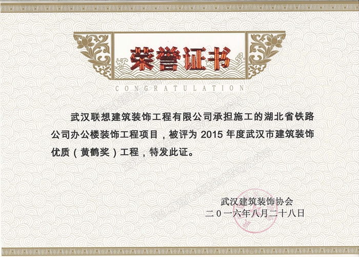 2015年度武漢市建筑裝飾優(yōu)質(zhì)工程黃鶴杯(湖北省鐵路公司辦公樓裝飾工程)