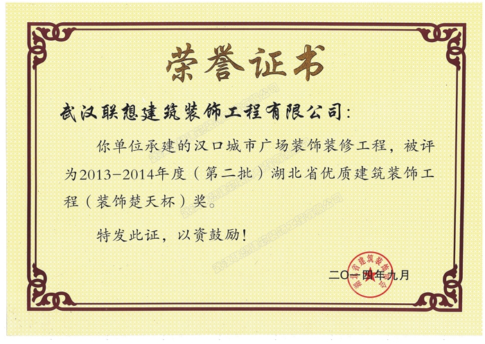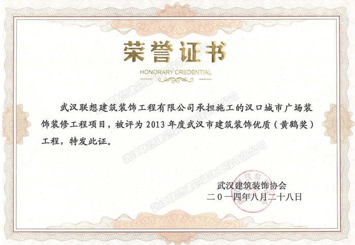 2013年度武漢市建筑裝飾優(yōu)質(zhì)工程黃鶴杯(漢口城市廣場(chǎng)裝飾裝修工程)