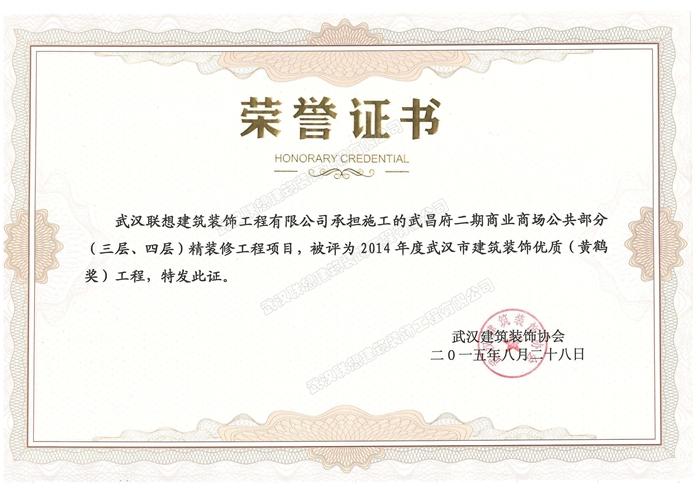 2014年度武漢市建筑裝飾優(yōu)質(zhì)工程黃鶴杯(武昌府二期商業(yè)商場(chǎng)公共部分三四層精裝修工程)